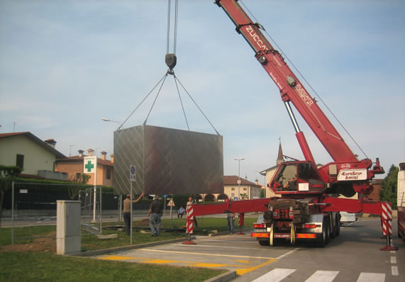 Il progetto proposto oltre ad addempiere ai suddetti presupposti ha portato come punti di forza una alta visibilita´, un confort interno, una ergonomia nell´uso anche per i portatori di svantaggi motori, una forza di immagine subordinata alla eleganza del rivestimento, personabilizzabile all´interno, ma con una finitura esterna in acciaio inox ammorbidito dalla decorazione delle piastre romboidali che interpretano il simbolo Internazionale associato comunemente agli sportelli automatici.